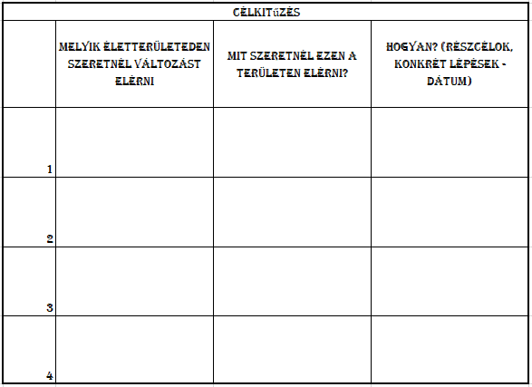 Az itt látható linken le tudod menteni és ki tudod tölteni a saját célkitűzés táblázatod!